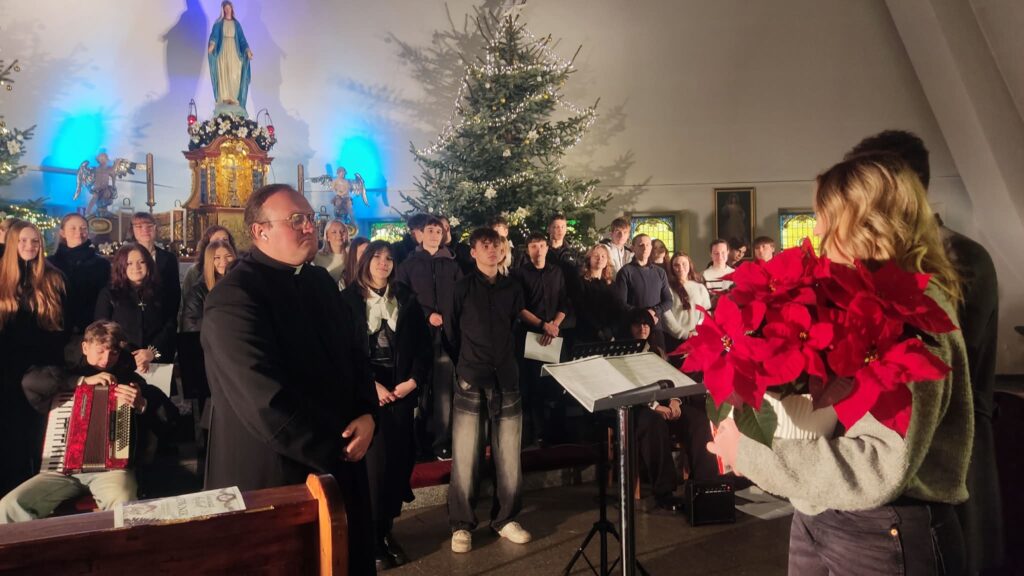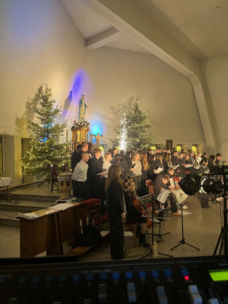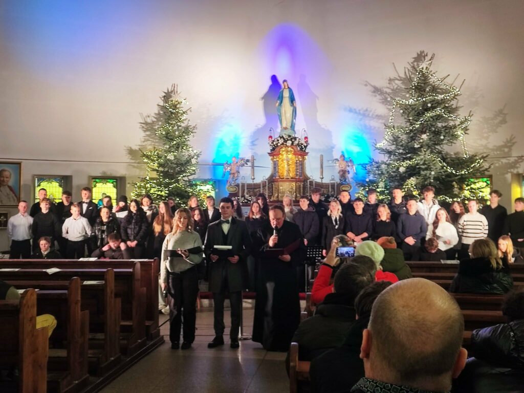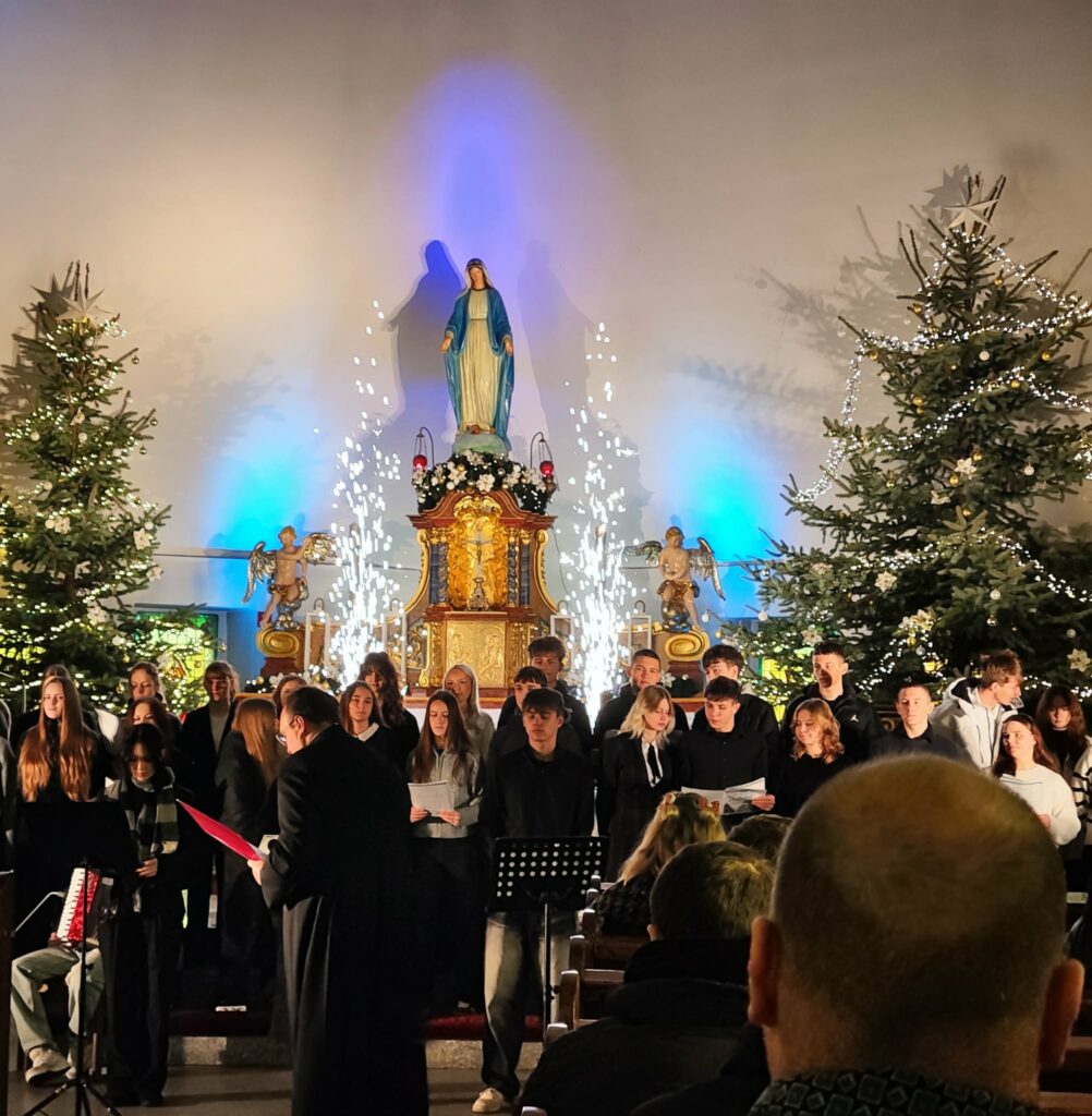 19 grudnia o godzinie 12.00 w naszym kościele pw. Niepokalanego Poczęcia Najświętszej Maryi Panny odbył się wyjątkowy koncert kolęd w wykonaniu uczniów naszej szkoły, przygotowany pod kierunkiem ks. Bartosza Kocura. Występujący instrumentaliści, wokaliści oraz chór w niezwykle sugestywny sposób przybliżyli historię Narodzenia Jezusa, prezentując kolędy zarówno w tradycyjnych, jak i nowoczesnych aranżacjach.