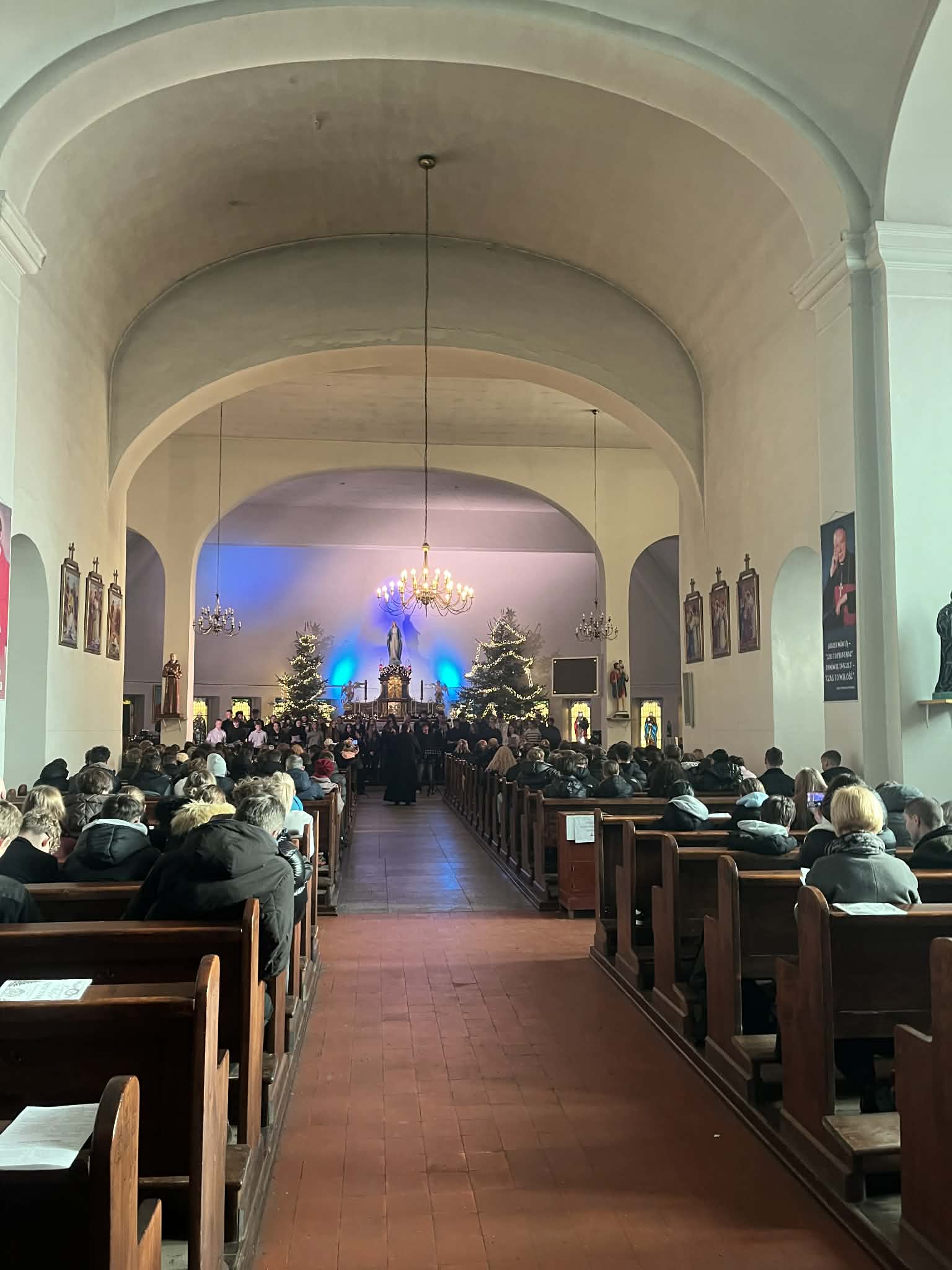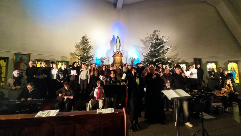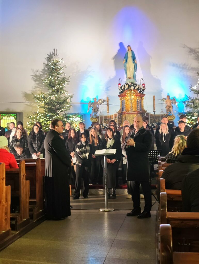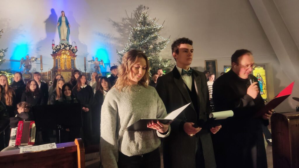 19 grudnia o godzinie 12.00 w naszym kościele pw. Niepokalanego Poczęcia Najświętszej Maryi Panny odbył się wyjątkowy koncert kolęd w wykonaniu uczniów naszej szkoły, przygotowany pod kierunkiem ks. Bartosza Kocura. Występujący instrumentaliści, wokaliści oraz chór w niezwykle sugestywny sposób przybliżyli historię Narodzenia Jezusa, prezentując kolędy zarówno w tradycyjnych, jak i nowoczesnych aranżacjach.